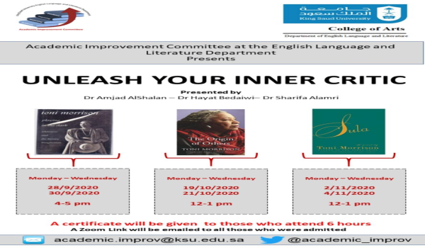 عقد يوم الاثنين ٢٨/٩/٢٠٢٠ ويوم الاربعاء٣٠/٩/٢٠٢٠ بقسم اللغة الانجليزية وآدابها، بإشراف لجنة التطوير الأكاديمي برئاسة الدكتورة منال الإسماعيل، ورشتا عمل للدكتورة أمجاد الشعلان بعنوان “أطلقي العنان لصوتك كناقد أدبي” ضمن سلسة متتالية لتعليم الطالبات على مهارات القراءة النقدية والأدبية عن طريق تدريب الطالبات على تحليل ثلاث كتب من أعمال الكاتبة الأمريكية توني موريسون «اللعب في الظلام، أصل الآخر، وسولا».