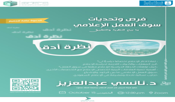 انتقلت د. نانسي إلى محور آخر بعنوان «سوق العمل الإعلامي ما بين الركود والإشباع»، مطمئنهً الطالبات على مستقبلهن في دراسة الإعلام بقولها: «إنه قادم بقوة ولم يفت»، مدللة على ذلك بحاجة جميع الشركات والمؤسسات إلى شخص دارس لعلم التواصل بمهاراته وتقنياته، وذلك وفقاً للإحصاءات التي أجرتها العديد من المواقع التي ترصد مستقبل التخصصات المختلفة بناء على إحصاءات سوق العمل على المستوى العالمي مثل موقع «DEGREE QUERY» الذي أظهر أن الإعلام واحد من أفضل خمسين تخصصاً مستقبلياً، محتلاً المركز «13» من بين التخصصات، ومشيرة إلى أهم استراتيجيات رؤية 2030 وهي تقليل حجم الوظيفة الحكومية لحساب القطاع الخاص وتشجيع الخريجين على الإنتاج الذاتي، ومنوهة بالقول: «إن السوق الإعلامي مفتوح على مصراعيه وفق ضوابط وشروط»، واختتمت هذا المحور بتقديم رؤية تفاؤلية بالإعلان عن قرب إنشاء مدينة إعلامية بالرياض، مبشرة ببداية صناعة إبداعية مستقبلية في المملكة تساهم في خلق صناعة ثقافية تعمل على إحياء الفن والمسرح والإرث التراثي الوطني الكبير.