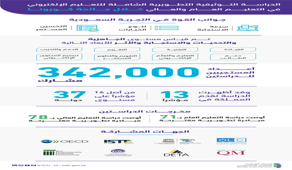 أعلن المركز الوطني للتعليم الإلكتروني عن انتهاء 6 جهات عالمية من إجراء دراستين شاملتين عن تجربة التعليم العام والعالي بالمملكة خلال جائحة كورونا، وذلك بهدف توثيق ودراسة واقع التجربة، والخروج بمبادرات للتطوير والارتقاء بممارسات التعليم الإلكتروني في المملكة وفق أحدث الممارسات والمعايير العالمية في هذا المجال.