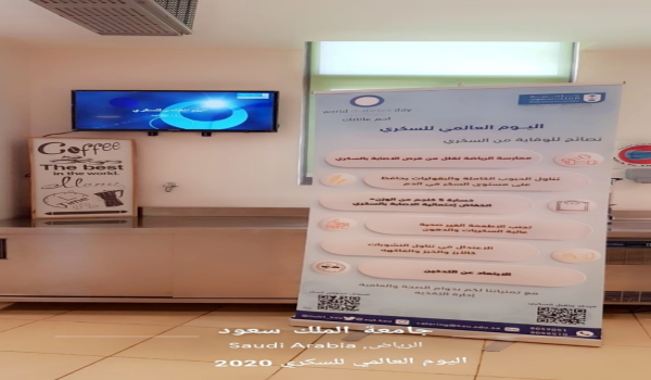 نظمت إدارة التغذية فعالية توعوية في مطعم سكن الطالبات بالتزامن مع «اليوم العالمي للسكري» وذلك يوم الأحد 29 ربيع الأول 1442هـ، بهدف تعزيز الوقاية الغذائية عن طريق عمل بوسترات إلكترونية وفيديو توعوي عن المرض وطرق الوقاية الغذائية منه.