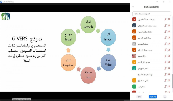 بعد ذلك تم عرض عدة تجارب في مجال القيادة الرياضية والتطوع الرياضي مثل تنظيم الأولمبيات الرياضية والمحافل الدولية الكبرى والمنافسات الرياضية والتي يتجاوز عدد المتطوعين فيها أكثر من مئة ألف مشارك.