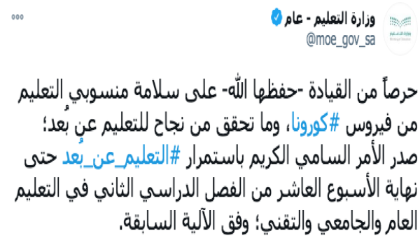 وقالت في بيان لها: حرصاً من القيادة الرشيدة - حفظها الله - على سلامة أبنائها وبناتها من الطلاب والطالبات، وحمايتهم من مخاطر تعرّضهم للإصابة بفيروس كورونا، وتأكيداً على ضمان استمرار رحلتهم التعليمية خلال الفصل الدراسي الثاني رغم ظروف الجائحة، وبعد دراسة واقع التعليم عن بُعد خلال الفترة السابقة، وتشكيل لجنتين في التعليم العام والجامعي للتقييم والمتابعة والتنسيق في ذلك مع وزارة الصحة، إلى جانب ما تحقق من نجاحات للتعليم عن بُعد من خلال منصة مدرستي، والبدائل التعليمية المختلفة كقنوات عين «23 قناة فضائية»، وقنوات دروس في اليوتيوب، وبوابة التعليم الوطنية عين، وتطبيق الروضة الافتراضية، إضافة إلى استمرار عمليات التعليم عن بُعد بكفاءة في الجامعات والكليات والمعاهد، بما يُعد نجاحاً للتعليم في المملكة، فقد تقرر ما يلي: