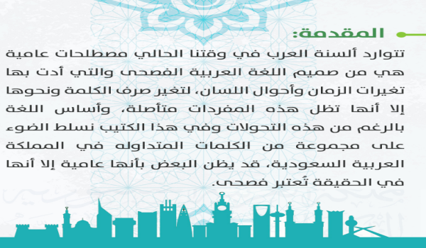 أكدت الطالبات في المقدمة أن ألسنة العرب تتواردها في وقتنا الحالي مصطلحات عامية هي من صميم اللغة العربية الفصحى والتي أدت بها تغيرات الزمان وأحوال اللسان لتغير صرف الكلمة ونحوها إلا أنها تظل هذه المفردات متأصلة، وأساس اللغة بالرغم من هذه التحولات وفي هذا الكتيب نسلط الضوء على مجموعة من الكلمات المتداولة في المملكة العربية السعودية، قد يظن البعض بأنها عامية إلا أنها في الحقيقة تعتبر فصحى.