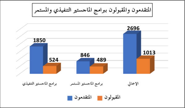 فقد بلغ إجمالي عدد المتقدمين 2696 متقدماً ومتقدمة، موزعين كالتالي: 1850 طلباً للالتحاق ببرامج الماجستير التنفيذي وعددها 11 برنامجاً، و846 طلباً للالتحاق ببرامج الدراسات العليا بنظام التعليم المستمر وعددها 21 برنامجاً، وبعد الانتهاء من إجراءات القبول تم قبول 524 طالباً وطالبة ببرامج الماجستير التنفيذي، وقبول 489 طالباً وطالبة ببرامج الدراسات العليا بنظام التعليم المستمر.