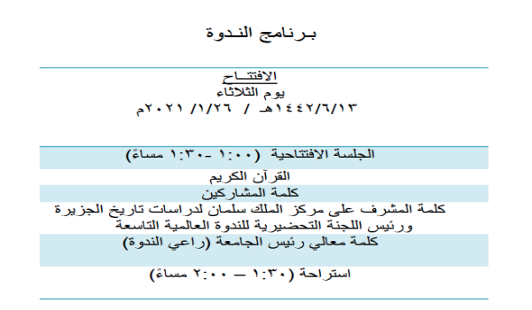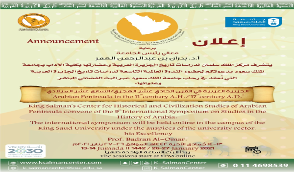 ينظم مركز الملك سلمان لدراسات تاريخ الجزيرة العربية وحضارتها بجامعة الملك سعود، الندوة العالمية التاسعة لدراسات تاريخ الجزيزة العربية، عن بعد عبر تقنية البث الفضائي المباشر، يومي الثلاثاء والأربعاء القادمين «13 - 14 جمادى الآخرة 1442هـ الموافق 26-27 يناير 2021م».