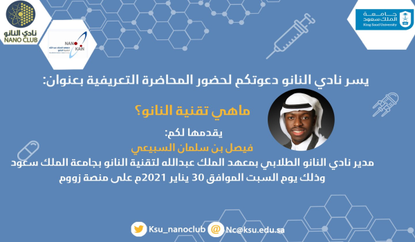 نظم نادي النانو الطلابي محاضرة تعريفية بعنوان «ما هي تقنية النانو» وذلك يوم الأحد 17 جمادى الآخرة 1442 هـ قدمها مدير النادي فيصل السبيعي لعدد من طلاب النادي عبر تقنية الاتصال المرئي «زووم»، وتم خلال المحاضرة، التعريف بتقنية النانو وكيفية ظهور التقنية ومبادئ تحضير المواد النانوية وبعض تطبيقاته