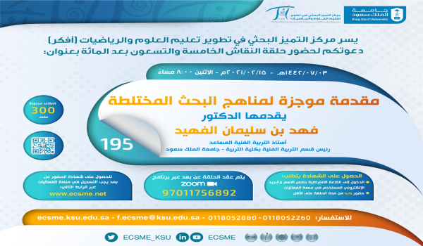 تنظم وحدة التنمية البشرية في مركز التميز البحثي في تطوير تعليم العلوم والرياضيات «أفكر» الحلقة الخامسة والتسعين بعد المائة ضمن سلسلة حلقات النقاش التي يعقدها المركز أسبوعيا بعنوان «مقدمة موجزة لمناهج البحث المختلطة» من إعداد وتقديم الدكتور فهد بن سليمان الفهيد، أستاذ التربية الفنية المساعد، رئيس قسم التربية الفنية بكلية التربية جامعة الملك سعود، وذلك يوم غد الاثنين 3/7/1442هـ، الموافق 15 / 2/ 2021 م، في تمام الساعة الثامنة مساء عن طريق قاعات زوم الافتراضية عبر الرابط التالي: 97011756892