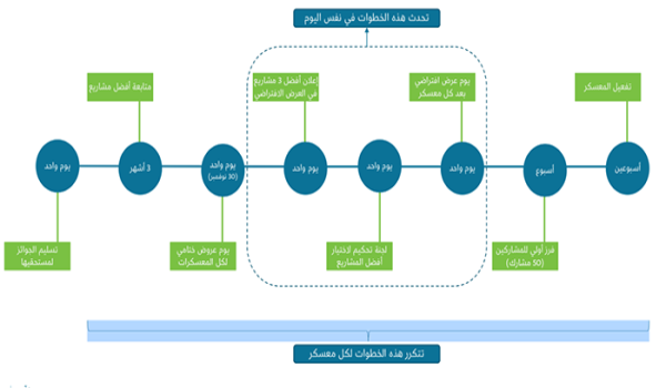 وأعلن أنه سيتم في نهاية المعسكرات اختيار أفضل ٣ عروض مشاريع للفوز بجوائز مالية: ٣٠،٠٠٠ ريال للمركز الأول، و٢٠،٠٠٠ ريال للمركز الثاني، و١٠،٠٠٠ ريال للمركز الثالث، مؤكداً أنه سيكون هناك عدة معسكرات تدريبية، وأول معسكر يبدأ اليوم الأحد ١٤ فبراير ٢٠٢١م.
