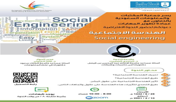 نظمت جمعية المكتبات والمعلومات السعودية، يوم الخميس 29/6/1442هـ ندوة افتراضية بعنوان «الهندسة الاجتماعية»، قدمتها الدكتورة البندري بنت فهد الصميت، الأستاذ المساعد في جامعة الامام عبدالرحمن بن فيصل والمتخصصة في أمن الحاسبات والشبكات، وتضمنت الندوة أربعة محاور هي: تعريف الهندسة الاجتماعية، وطرق الهندسة الاجتماعية، وتأثير الهندسة الاجتماعية على عقول البشر، وطرق التصدي لتأثيرات هذه الهندسة على عقول واتجاهات الناس، وتابعها عبر برنامج «زووم» ما يقارب 700 متابع، وقدم الندوة الدكتور فايز العتيبي عضو هيئة التدريس بكلية الآداب بجامعة الملك سعود، وعضو جمعية المكتبات والمعلومات السعودية.