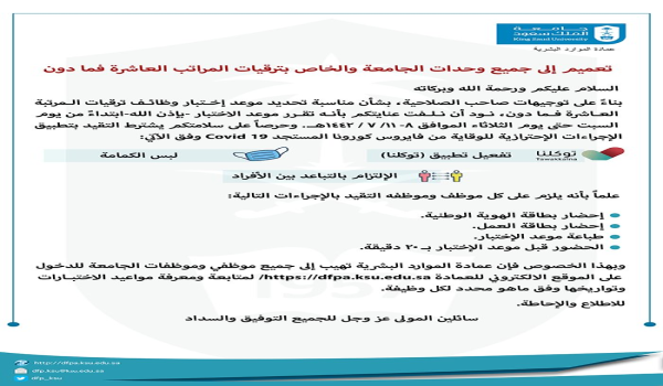 دعت عمادة الموارد البشرية بالجامعة مؤخراً موظفي وموظفات الجامعة المستحقين والمستحقات للترقية للدخول على الموقع الإلكتروني للعمادة http://dfpa.ksu.edu.sa/ وذلك لمتابعة ومعرفة مواعيد الاختبار وفق ما هو محدد لكل وظيفة؛ مشترطةً التقيد بتطبيق الإجراءات الاحترازية للوقاية من فيروس كورونا المستجد Covid-19 من خلال تفعيل تطبيق توكلنا، لبس الكمامة والالتزام بالتباعد بين الافراد؛ داعيةً جميع المستحقين والمستحقات للترقية إلى إحضار بطاقة الهوية الوطنية وبطاقة العمل، طباعة موعد الاختبار، والحضور قبل موعد الاختبار بـ 20 دقيقة.