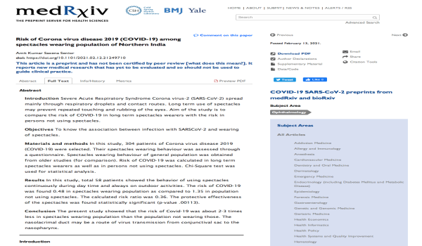 وأوضحت الدراسة: «أظهرت التجارب الحالية أن خطر الإصابة بكورونا كان أقل بحوالي مرتين إلى 3 مرات مع ارتداء النظارات مقارنة بعد ارتدائها».