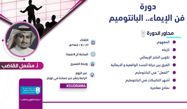 نظمت وحدة المسرح بعمادة شؤون الطلاب مؤخرًا دورة تدريبية بعنوان «فن الإيماء.. البانتوميم»، قدمها الأستاذ مشعل القاضب «عن بعد» عبر تطبيق زووم.