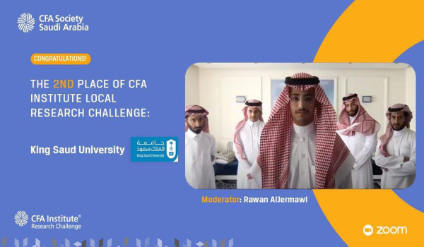 حقق فريق من كلية إدارة الأعمال بقسم المالية المركز الثاني في مسابقة CFA reseach challenge، والتي نظمتها الجمعية السعودية للمحللين المعتمدين «CFA» بمشاركة عدد كبير من طلاب الجامعات السعودية، وحصل فريق الجامعة على المركز الثاني، وبذلك يتأهل إلى المنافسة القادمة على مستوى جامعات الشرق الأوسط.