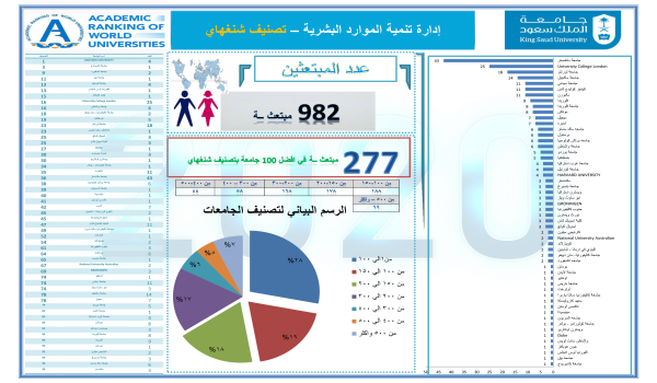 وأوضح التقرير أعداد وإحصائيات مبتعثي الجامعة في الخارج، مبيناً أن نسبة 28% منهم في الجامعات المصنفة من «1-100» حسب «تصنيف شنغهاي»، والذي يعتبر أحد التصنيفات العالمية للجامعات والذي بدأ منذ عام ٢٠٠٣م، ويهتم بترتيب الجامعات على المستوى الأكاديمي، ويعتمد في ذلك على العديد من الإحصائيات التي يتم توزيعها على كافة الأساتذة والدارسين واحتلت جامعة هارفارد أعلى التصنيف.
