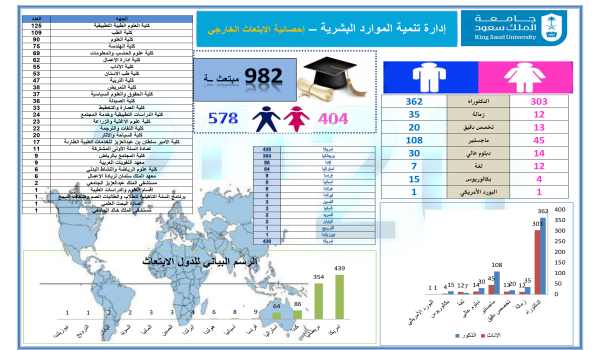 ابتعثت جامعة الملك سعود مؤخراً «277» مبتعثاً ومبتعثه إلى أفضل «100» جامعة عالمية حسب تصنيف شنغهاي، وذلك من أصل «982» مبتعثاً ومبتعثة خلال عام 2020م؛ جاء ذلك خلال التقرير السنوي لإدارة تنمية الموارد البشرية في عمادة الموارد البشرية.