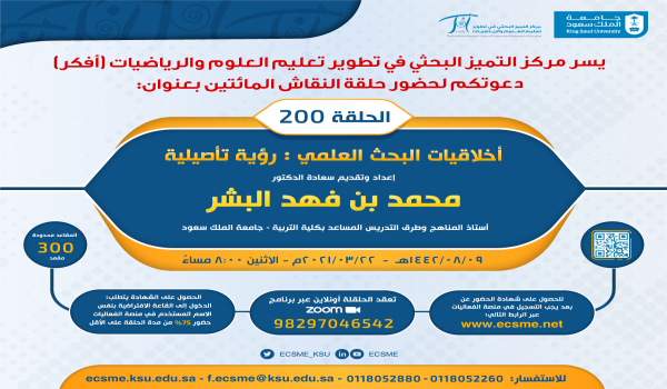 تنظم وحدة التنمية البشرية في مركز التميز البحثي في تطوير تعليم العلوم والرياضيات «أفكر» حلقتها المائتين ضمن سلسلة حلقات النقاش التي يعقدها المركز أسبوعياً بعنوان «أخلاقيات البحث العلمي: رؤية تأصيلية» من إعداد وتقديم الدكتور محمد بن فهد البشر أستاذ المناهج وطرق التدريس المساعد بكلية التربية جامعة الملك سعود، وذلك يوم غد الاثنين 09/08/1442هـ 22/03/2021م في تمام الساعة الثامنة مساء عن طريق قاعات زوم الافتراضية.