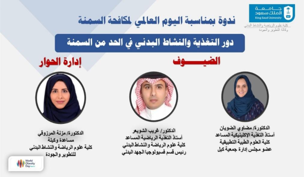 في البداية رحبت الدكتورة مزنة المرزوقي بالحضور مؤكدة على أهمية مكافحة السمنة، ثم تحدث كل من الدكتورة مضاوي الضويان أستاذة التغذية الإكلينيكية المساعد بكلية العلوم الطبية التطبيقية وعضو مجلس إدارة جمعية «كيل»، والدكتور غريب الشويعر أستاذ التغذية الرياضية المساعد بالكلية عن فعاليات اليوم العالمي لمكافحة السمنة وتسليط الضوء على مخاطرها وأهمية اتباع نمط حياتي صحي للحد من نسبة انتشارها.