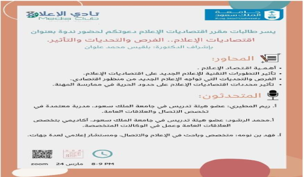 نظمت طالبات مقرر اقتصاديات الإعلام برعاية نادي الإعلام بكلية الآداب ندوة عبر برنامج زووم بعنوان «اقتصاديات الإعلام.. الفرص والتحديات والتأثير» بإشراف الدكتورة بلقيس محمد علوان، وناقشت الندوة أهمية اقتصاد الإعلام، وتأثير التطورات التقنية للإعلام الجديد عليه، بالإضافة إلى الفرص والتحديات التي تواجه الإعلام الجديد من منظور اقتصادي، وتأثير محددات اقتصاديات الإعلام على حدود الحرية في ممارسة المهنة.