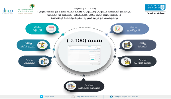 كشف عميد الموارد البشرية بالجامعة الدكتور سالم الرجيعي أن إدارة الخدمات الإلكترونية بالعمادة حققت نسبة 100% في الربط الآلي للقوائم المعلوماتية في خدمة «التزام» مع وزارة الموارد البشرية والتنمية الاجتماعية بالتعاون مع برنامج التعاملات الإلكترونية «يسّر»، والتي شملت ربط: البيانات الوظيفية، بيانات الوظائف، بيانات مسير الرواتب، بيانات الإجازات، بيانات تقييم الأداء، وبيانات المؤهلات.