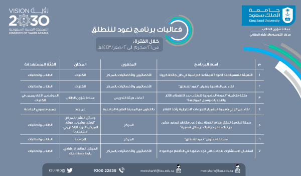 وبهذه المناسبة أكد عميد شؤون الطلاب الدكتور علي بن كناخر الدلبحي أن البرنامج يأتي ضمن باكورة من البرامج والأعمال الذي يحرص مركز التوجيه والارشاد الطلابي على تنفيذها لهذا العام 1443، وذلك تجسيداً للدور الذي يقدمه المركز في المجال التوعوي والتثقيفي والارشادي، مشيراً الى أن البرنامج سيتخلله مجموعة من المحاضرات وورش العمل وحلقات النقاش والحملات الإعلامية مما يسهم ذلك في تهيئة ابنائنا الطلبة لعودة آمنة على مقاعد الدراسة.
