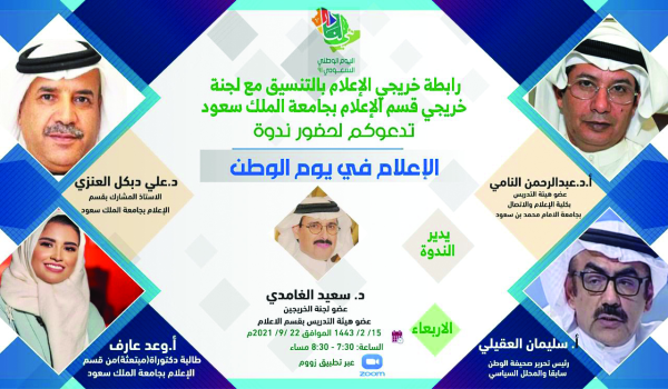 نظمت رابطة خريجي الإعلام بالتنسيق مع لجنة خريجي قسم الإعلام بجامعة الملك سعود ندوة  بعنوان « الإعلام في يوم الوطن» - تزامناً مع اليوم الوطني السعودي 91 -  وذلك يوم الأربعاء 22ستمبر 2021  ، الموافق 15 / 2 / 1443 هـ ، حيث حضر فيها نخبة من أساتذة الإعلام و هم  أ.د. عبدالرحمن النامي عضو هيئة التدريس في كلية الإعلام والاتصال جامعة الإمام محمد بن سعود ، د. علي بن دبكل العنزي رئيس قسم الإعلام بجامعة الملك سعود سابقاً ، أ. سليمان العقيلي رئيس تحرير صحيفة الوطن سابقاً والمحلل السياسي  ، أ. وعد عارف طالبة الدكتوراه والمبتعثة من قسم الإعلام ، في حين أدراها د. سعيد الغامدي عضو هيئة التدريس بالقسم .