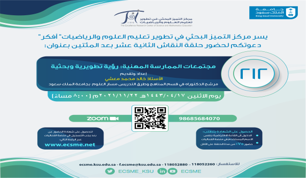تنظم وحدة التنمية البشرية في مركز التميز البحثي في تطوير تعليم العلوم والرياضيات«أفكر» عند الثامنة من مساء غداً الاثنين، حلقتها الثانية عشر بعد المئتين ضمن سلسلة حلقات النقاش التي يعقدها المركز أسبوعياً بعنوان « مجتمعات الممارسة المهنية: رؤية تطويرية وبحثية »يقدمها الأستاذ خالد محمد معشي مرشح الدكتوراه في قسم المناهج وطرق التدريس مسار العلوم –جامعة الملك سعود، وذلك عن طريق قاعات زوم الافتراضية عبر الرابط التالي : https://zoom.us/j/98685684070.