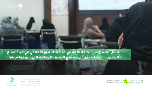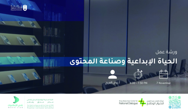 استضاف مركز الملك عبد العزيز للحوار الوطني مجموعة من طلبة جامعة الملك سعود بمختلف تخصصاتهم ،وقادة الأندية الطلابية في لقاء بعنوان «قمة الجيل الإعلامي»، تحت شعار «فرصتنا لنلهم العالم بحوارنا»، في تجربة محاكية لقمة العشرين ليقودوا فيها دفة الحوار حول مجموعة قضايا إعلامية من وحي تجاربهم في ميدان الأنشطة، و يتناقشوا في فرص الجيل الإعلامي وتحدياته في القرن الحادي والعشرين، بهدف تحقيق رؤية إنتاج جيل إعلامي «مبادر،محاور،ماهر» وذلك على مدار يومي «الأحد والإثنين» الموافقين 7-8 نوفمير 2021م.