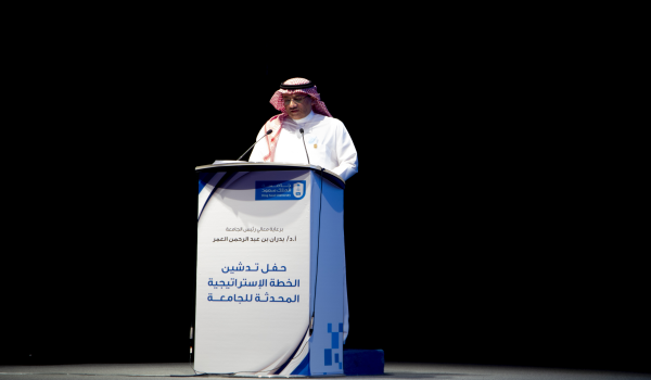 من جهته استهل معالي الدكتور بدران العمر رئيس الجامعة كلمته بالترحيب بحضور الحفل من أعضاء وعضوات هيئة التدريس والموظفين والموظفات، والطلاب والطالبات المنتمَ للجامعة، وذكر معاليه أننا اليومَ نطلقُ خطةَ بناء مستقبل مشرق لجامعة متجددةٍ وفق رؤية سعودية ملهمة.