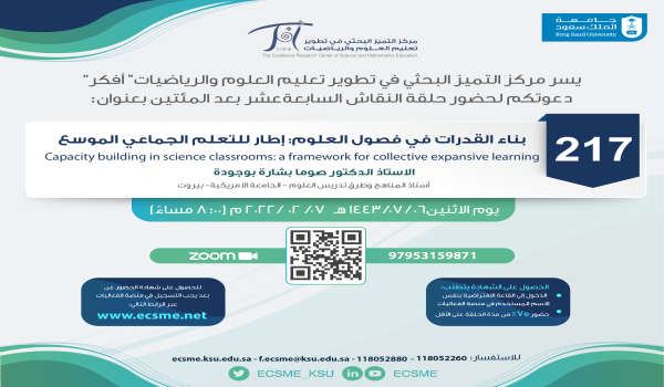 تنظم وحدة التنمية البشرية في مركز التميز البحثي في تطوير تعليم العلوم والرياضيات «أفكر» عند الثامنة من مساء غداً الاثنين، حلقتها السادسة عشر بعد المئتين ضمن سلسلة حلقات النقاش التي يعقدها المركز أسبوعياً بعنوان « بناء القدرات في فصول العلوم: إطار للتعلم الجماعي الموسع» ويقدمها الدكتور صوما بشارة بوجودة أستاذ مناهج وطرق تدريس العلوم -الجامعة الامريكية-بيروت ، وذلك عن طريق قاعات زوم الافتراضية عبر الرابط التالي: