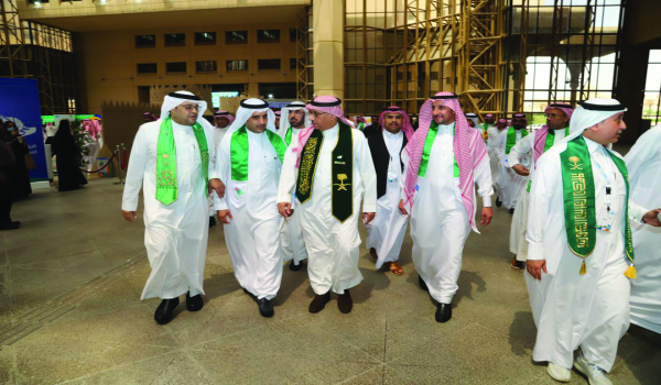 بعدها افتتح معاليه المعرض المصاحب الذي تضمن أركاناً تحكي معاني جوهرية وتاريخية لعراقة المملكة بداية من ركن العلم الذي استعرض تاريخ الراية الوطنية وملحقاتها مرورًا بمشاركة وطنية متنوعة من الأندية الطلابية وصولاً إلى عرض للصور الفوتوغرافية والفن التشكيلي ومواهب الخط العربي والرسم على الرمل وغيرها من الفنون التي شارك في تقديمها طلبة الجامعة ومجلس شباب منطقة الرياض، واختتمت العروض بأداء العرضة السعودية.