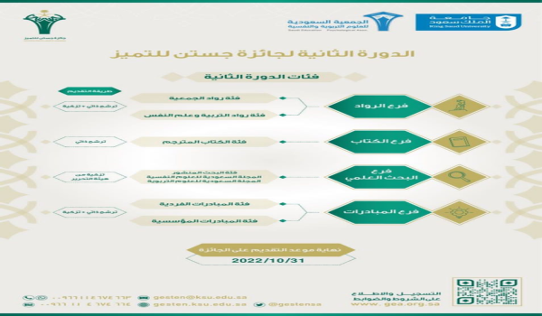أعلنت الجمعية السعودية للعلوم التربوية والنفسية (جستن) عن بدء التقديم والتسجيل في الدورة الثانية لـ (جائزة جستن للتميز).