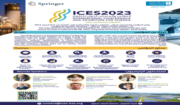 ـ وضعت المملكة رؤية مبنية على مكامن قوة هذا الوطن وقدراته الفريدة، حيث حققت برامج تنفيذ الرؤية نجاحات ملحوظة على صعيد محاور الرؤية الثلاث: وطن طموح، واقتصاد مزدهر، ومجتمع حيوي. ويسهم البحث العلمي الفعال في بناء الاقتصاد وتحقيق التنمية، ويأتي هذا المؤتمر ICES 2023 لتحقيق ذلك من خلال الأهداف التالية: إبراز دور المملكة في مجال العلوم الأساسية للانتقال إلى أحد المراكز العشر الأولى في مؤشر التنافسية العالمي (وطن طموح). وإبراز دور العلوم الأساسية في زيادة الناتج الوطني للبحث العلمي ودعم منظومة البحث والابتكار للتحول نحو اقتصاد مستدام مبني على المعرفة (اقتصاد مزدهر- وطن طموح). وإبراز دور العلوم الأساسية والبحث العلمي في تنمية قطاع التعدين وصناعة البتروكيماويات والمستجدات العلمية في مجال الطاقة المتجددة (اقتصاد مزدهر- مجتمع حيوي). وإبراز أهمية النواتج البحثية في مواجهة التحديات البيئية؛ لتحقيق مبادرة الشرق الأوسط الأخضر وبناء البيئة اللازمة لتحسين جودة الحياة وتطويرها (مجتمع حيوي- جودة الحياة). وتبادل الخبرات والتجارب التي تعكس الرغبة في التطوير والتنافسية العالمية في مجال العلوم الأساسية (وطن طموح). والمساهمة في تطوير وتوطين المهارات البحثية الأساسية ومهارات المستقبل وتنمية المعارف في مجال العلوم الأساسية (برنامج تنمية القدرات البشرية). والعمل على دعم المؤسسات المالية؛ لتقديم سوق مالية متقدمة وتعزيز وتمكين التخطيط المالي (برنامج تطوير القطاع المالي). وإبراز دور المرأة في مجال العلوم والصناعة ودور المملكة في تعزيز مكانتها ومشاركاتها الفعالة في تطوير العلوم الأساسية (تمكين المرأة).