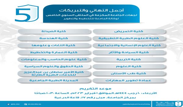 كلية العلوم الطبية التطبيقية، وكلية التمريض، وكلية الهندسة، وكلية العلوم الإنسانية والاجتماعية، وكلية اللغات وعلومها، وكلية السياحة والآثار، وكلية العمارة والتخطيط، وكلية التربية، وكلية علوم الحاسب والمعلومات، وكلية العلوم، وكلية الحقوق والعلوم السياسية، وكلية طب الأسنان، وكلية الأمير سلطان بن عبد العزيز للخدمات الطبية الطارئة. كما تضمن الملتقى تكريم الكيانات التي حصلت على الاعتماد وهي: المدينة الطبية الجامعية، وعمادة تطوير المهارات.