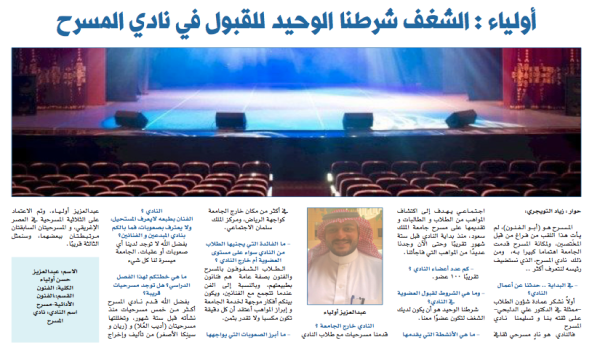 المسرح هو )أبو الفنون(، لم يأتِ هذا اللقب من فراغ من قبل المختصين، ولمكانة المسرح قدمت الجامعة اهتماما كبيرا به، ومن ذلك نادي المسرح، الذي نستضيف رئيسه لنتعرف أكثر ..