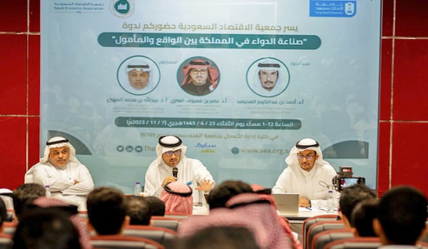 نظمت جمعية الاقتصاد السعودية ندوة بعنوان: صناعة الدواء في المملكة: بين الواقع والمأمول شارك فيها عميد كلية الصيدلة الدكتور عامر بن معيوف العنزي وخبير الصناعة الدوائية وعضو هيئة التدريس بالكلية الدكتور عبدالله بن محمد المهيزع، وقام بإدارة الندوة الدكتور أحمد بن عبدالكريم المحيميد رئيس مجلس إدارة الجمعية.