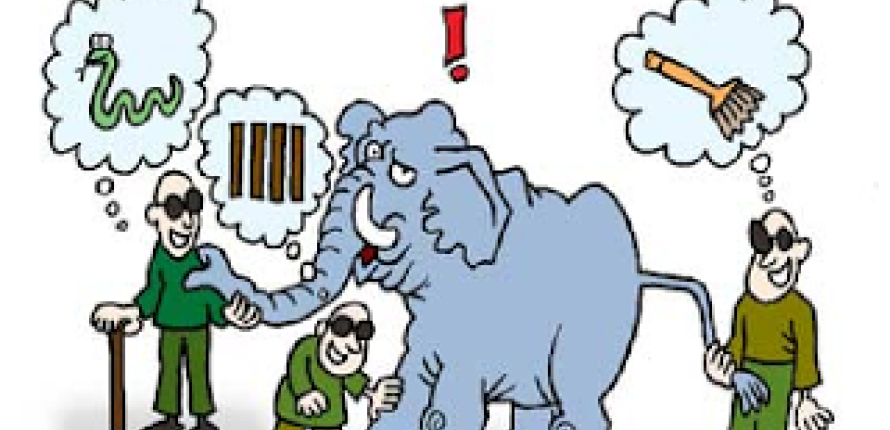 ﻳﺤﻜﻰ ﺃﻥ ﺛﻼﺛﺔ ﻣﻦ ﺍﻟﻌﻤﻴﺎﻥ ﺩﺧﻠﻮﺍ ﻓﻲ ﻏﺮﻓﺔ ﺑﻬﺎ ﻓﻴﻞ ﻭﻃﻠﺐ ﻣﻨﻬﻢ ﺃﻥ ﻳﻜﺘﺸﻔﻮﺍ ﻣﺎ ﻫﻮ ﺍﻟﻔﻴﻞ ﻟﻴﺒﺪﺃﻭﺍ ﻓﻲ ﻭﺻﻔﻪ، وبالفعل دخلوا تلك الغرفة وتحسسوا الفيل وخرج ﻛﻞ ﻣﻨﻬﻢ