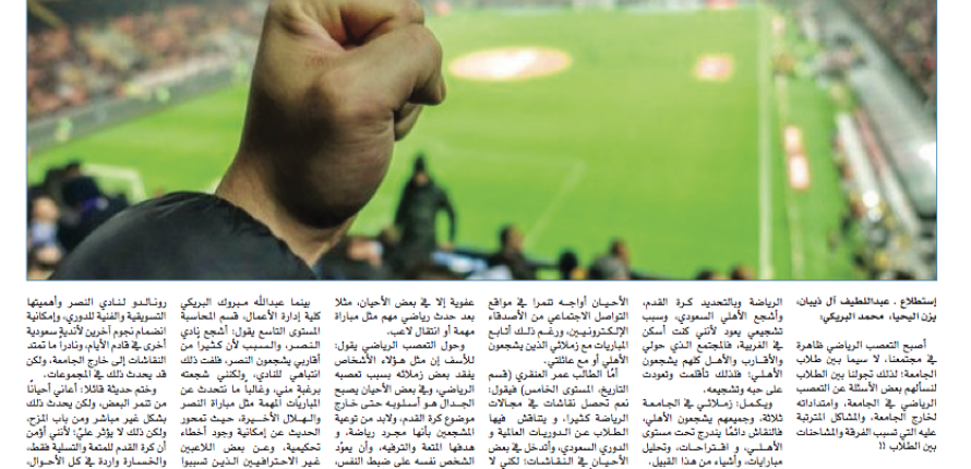 رسالة الجامعة تستطلع آراء الطلاب حول التعصب الرياضي 4 Jun 2023 بواسطة رسالة الجامعة رسالة الجامعة ـ عبداللطيف آل ذيبان، يزن اليحيا، محمد البريكي. أصبح التعصب الرياضي ظاهرة في مجتمعنا، لا سيما بين طلاب الجامعة؛ لذلك تجولنا بين اقرأ المزيد