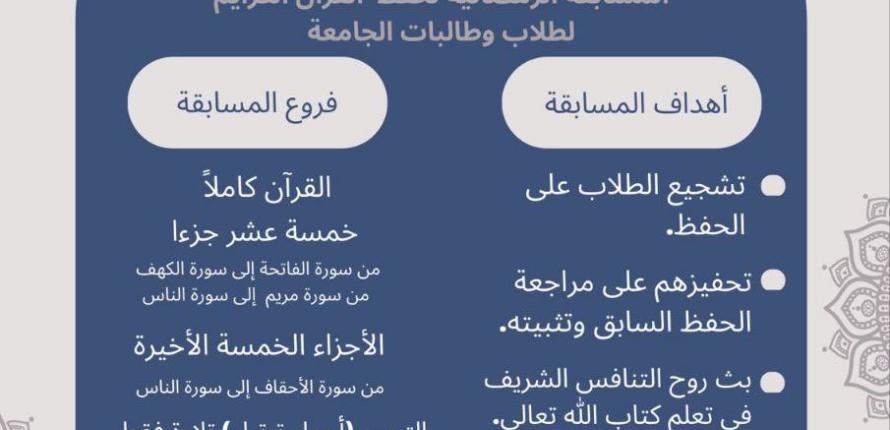 انطلاق المسابقة الرمضانية للقرآن الكريم للطلاب والطالبات 30 Mar 2023 بواسطة رسالة الجامعة رسالة الجامعة ـ إيمان الشهري: أعلنت عمادة شؤون الطلاب ممثلة بإدارة الأنشطة الطلابية وبالتعاون مع قسم الدراسات القرآنية بكلية التربية عن إطلاق اقرأ المزيد