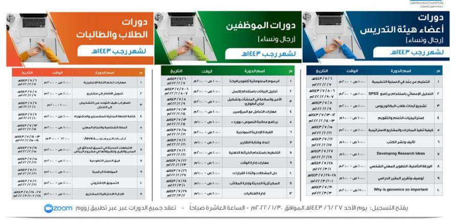 33 دورة تدريبية خلال رجب 27 Jan 2022 بواسطة رسالة الجامعة أعلنت عمادة تطوير المهارات عن تقديم 33 دورة تدريبية متنوعة لمنسوبي الجامعة من أعضاء وعضوات هيئة التدريس والموظفين والموظفات والطلاب والطالبات لشهر اقرأ المزيد
