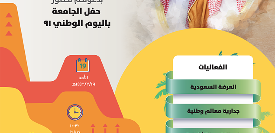 الجامعة تحتفل باليوم الوطني 91.. اليوم 22 Sep 2021 بواسطة رسالة الجامعة برعاية إدارة الجامعة ممثلةً بمعالي رئيس الجامعة الدكتور بدران العمر، تحيي جامعة الملك سعود صباح اليوم الأحد أحتفالاً بمناسبة ذكرى اليوم الوطني الـ91 اقرأ المزيد