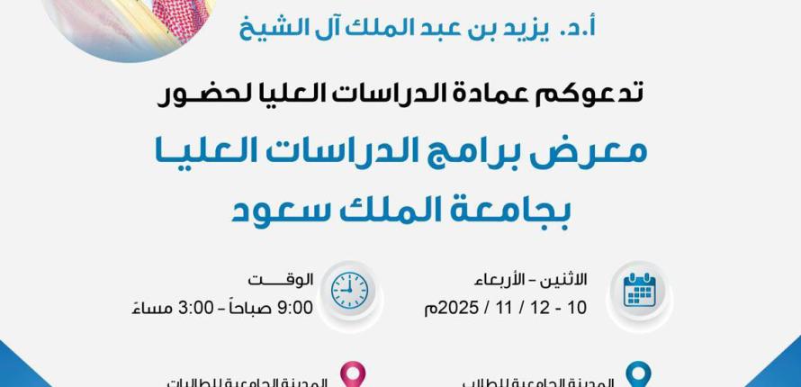 انطلاق معرض برامج الدراسات العليا .. الأثنين القادم 6 Nov 2025 بواسطة رسالة الجامعة برعاية سعادة نائب رئيس جامعة الملك سعود للدراسات العليا والبحث العلمي أ.د. يزيد بن عبدالملك آل الشيخ، تنظم عمادة الدراسات العليا معرض برامج اقرأ المزيد